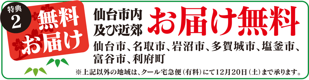 ※無料配達で受け取れるエリアは仙台市、名取市、岩沼市、多賀城市、塩竈市、富谷市、利府町です。